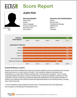 ELTiS 선발시험은 Ballard & Tighe에서 개발하였으며, 미국 국무부로부터 공인된 미국 정규 고등학교 입학용 영어 능력 평가시험입니다. 기존의 SLEP 시험(ETS 주관)이 폐지됨에 따라, 미국 국무부는 미국 고등학교 수업에 보다 적합한 평가 도구로 ELTiS를 채택하여 2015년 1월 학기부터 공식적으로 활용하고 있습니다. 또한, 교환학생 감독기구인 CSIET와의 공식 파트너십을 체결하여 미국 내 교환학생 및 유학 프로그램에서 신뢰받는 표준 영어 평가 시험으로 자리매김하였습니다.